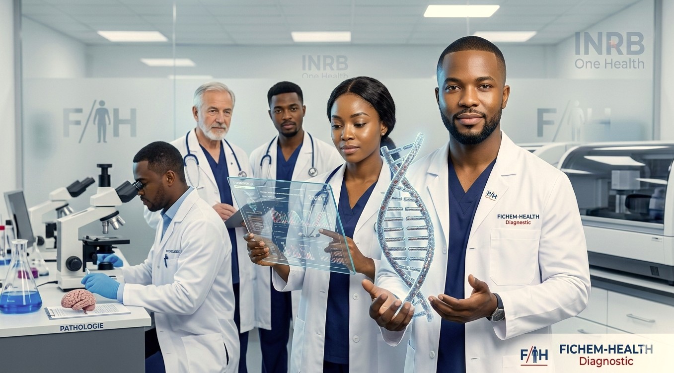 Cette image illustre le cœur battant de notre centre : une équipe multidisciplinaire dirigée par le Dr Rive LUKUAKU BUANZA. On y voit nos pathologistes et chercheurs évoluant dans un environnement de haute technologie, où la biologie moléculaire et l’anatomie pathologique se rejoignent pour percer les secrets du vivant.